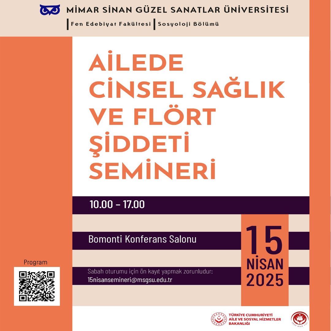 28 Kasım 2025, 16:00 Kent, Müzik ve Piyasa 24 Nisan 2025, 10:00 Murathan Mungan Sempozyumu 21 Nisan 2025, 10:00 3. Görsel Sosyoloji Sempozyumu 15 Nisan 2025, 10:00 Ailede Cinsel Sağlık ve Flört Şiddeti Semineri 05 Aralık 2024, 09:30 Sosyoloji Konferans 2024 21 Aralık 2023, 14:00 Sosyoloji Bölümü Paneli Daha Fazla