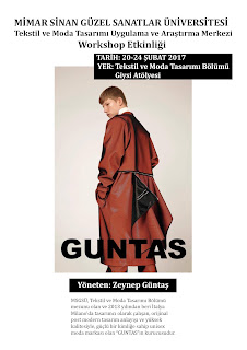 22 Mart 20170 Şubat-24 Şubat 2017 tarihleri arasında, Mimar Sinan Güzel Sanatlar Üniversitesi, Tekstil ve Moda Tasarımı Araştırma Uygulama Merkezi ve GUNTAS markasının kurucusu tasarımcısı Zeynep Güntaş işbirliğinde,“ “Lüks Sokak Modasına Yönelik Kapsül Koleksiyon Hazırlanması ve Marka Stratejisi” (Luxury Streetwear Capsule Collection Design and Branding Strategies) başlığı altında bir workshop gerçekleştirilmiştir. Moderatörlüğünü Prof. Dilek Alpan ve Arş. Gör. Sejda İnal Yılmaz’ ın yaptığı workshopta, Bölümümüz öğrencilerinden Aylin Çamaşuvi, Cemre Eren, Ceysu Uçar, Çağla Demirkıran, Fatma Süleymanoğlu, Nazlıcan Karahan, Şeyma Bayram ve Süreyya Süleymanoğlu katılmıştır. Bu çalışmada Tasarımcı Kimliği oluşturulurken, güncel trendleri de takip ederek, hızlı çalışma yöntemleri geliştirmek amaçlanmıştır.