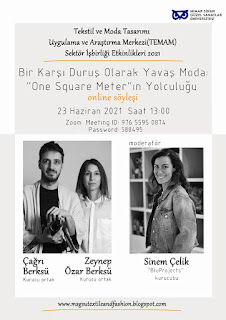 6 Temmuz 2021Tekstil ve Moda Tasarımı Uygulama ve Araştırma Merkezi(TEMAM) Sektör İşbirliği Etkinlikleri 2021 kapsamında, 23 Haziran 2021 tarihinde “One Square Meter” markasının kurucuları Çağrı Berksü ve Zeynep Özar Berksü ile online bir söyleşi gerçekleştirilmiştir.