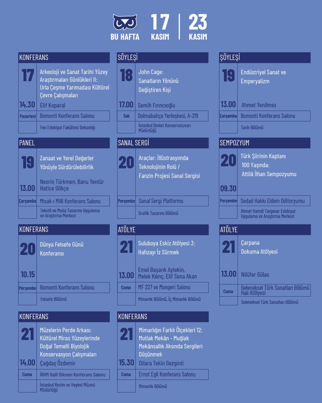 MSGSÜ’de Bu Hafta (17-23 Kasım 2025) 2025-2026 Güz Dönemi Ara Sınav Takvimleri 17 Kasım 2025, 14:30 Arkeoloji ve Sanat Tarihi Yüzey Araştırmaları Günlükleri 14 Kasım 2025, 09:00 Mimarlık ve Eğitim Kurultayı 13 Kasım 2025, 15:00 Editörlük / Metin Yazarlığı 05 Kasım 2025, 13:00 Handan İnci Elçi’nin Anısına Daha Fazla