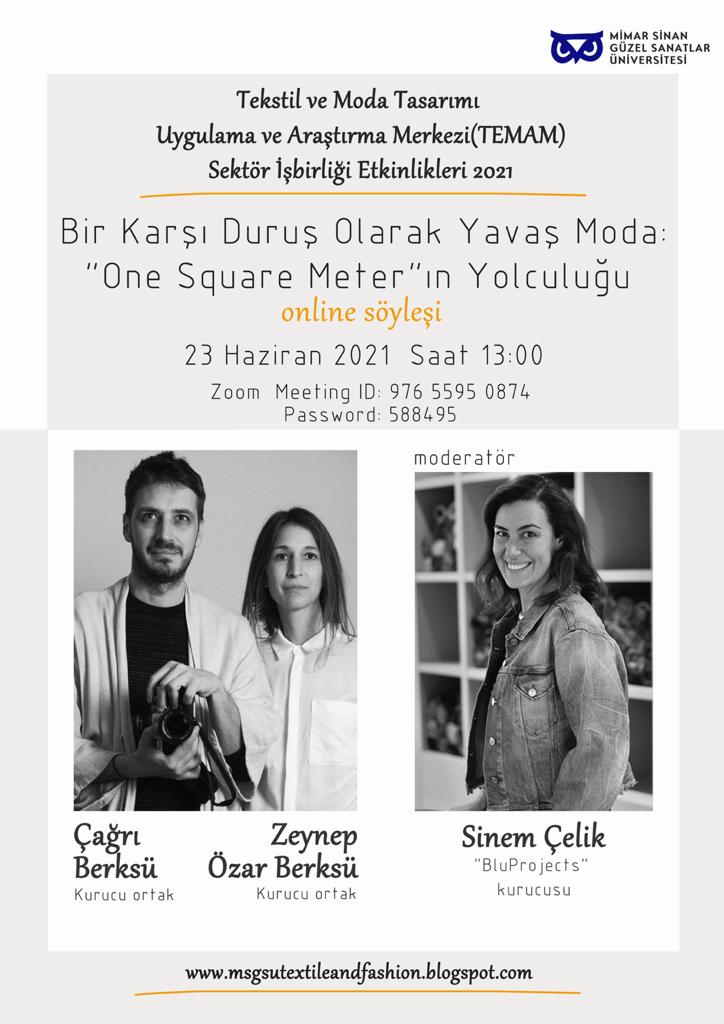 6 Temmuz 2021Tekstil ve Moda Tasarımı Uygulama ve Araştırma Merkezi(TEMAM) Sektör İşbirliği Etkinlikleri 2021 kapsamında, 23 Haziran 2021 tarihinde “One Square Meter” markasının kurucuları Çağrı Berksü ve Zeynep Özar Berksü ile online bir söyleşi gerçekleştirilmiştir.