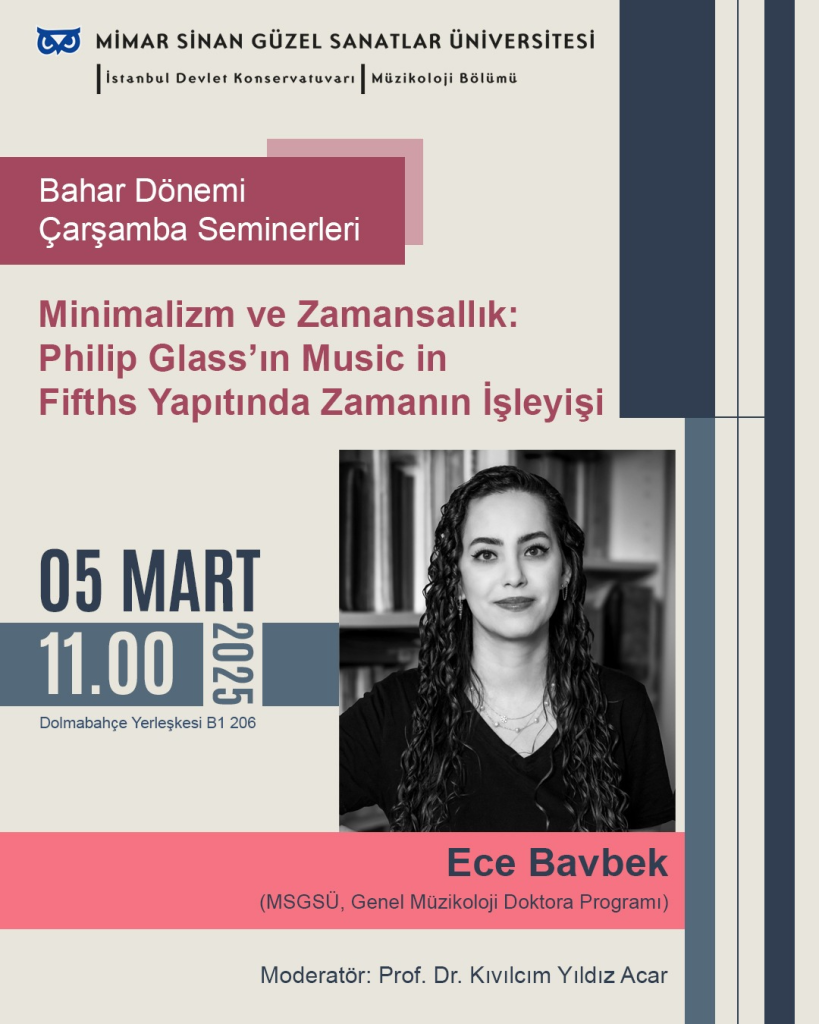 05 Mart 2025, 11:00Müzikoloji Bölümü tarafından Bahar Dönemi Çarşamba Seminerleri kapsamında düzenlenen “Minimalizm ve Zamansallık: Philip Glass’ın Music in Fifths Yapıtında Zamanın İşleyişi” başlıklı etkinlik 5 Mart 2025 tarihinde Dolmabahçe Yerleşkesi’nde yapılacaktır.