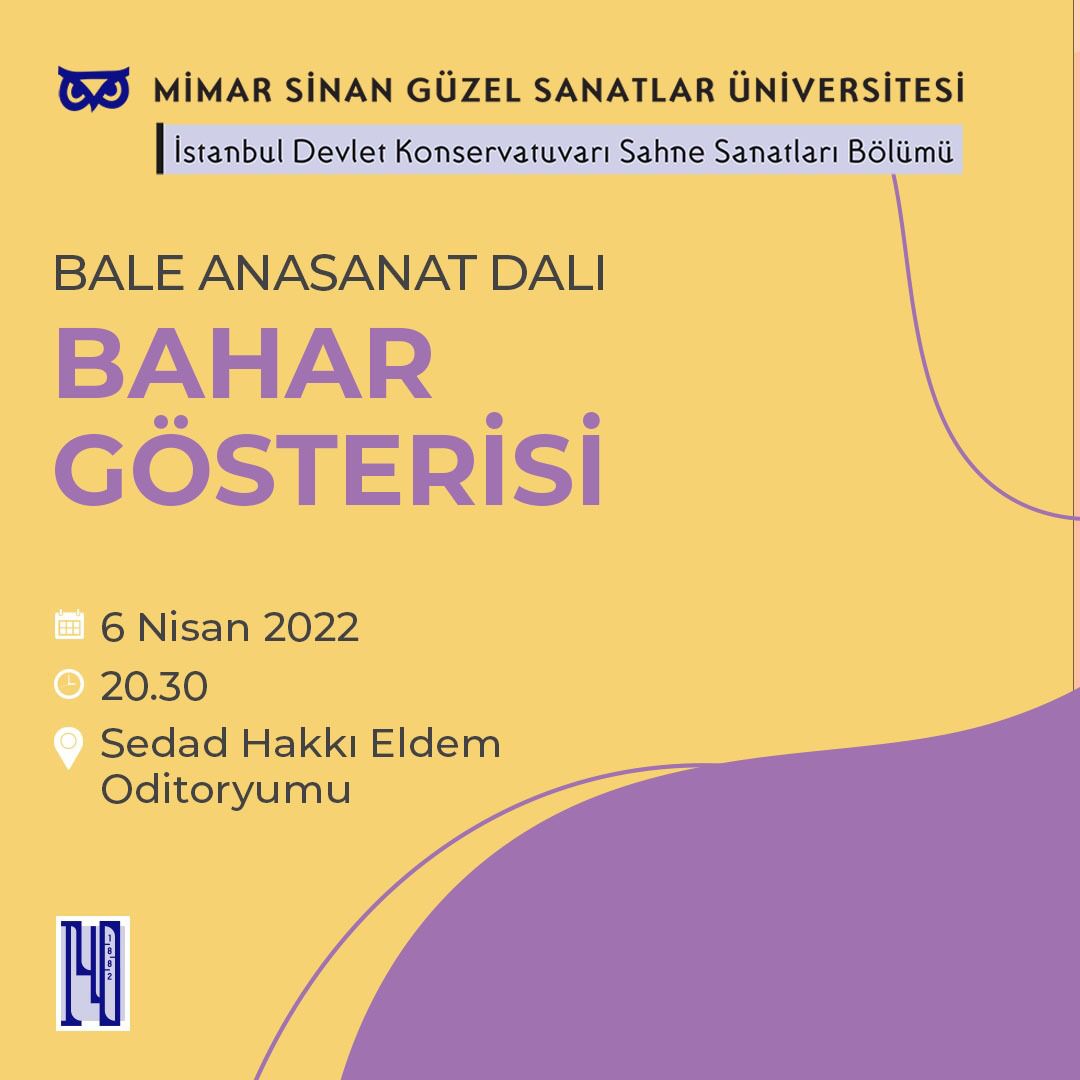 6 Nisan 2022İstanbul Devlet Konservatuvarı Bale Anasanat Dalı tarafından düzenlenen “Bahar Gösterisi“nin bilgilerine aşağıdan erişebilirsiniz.