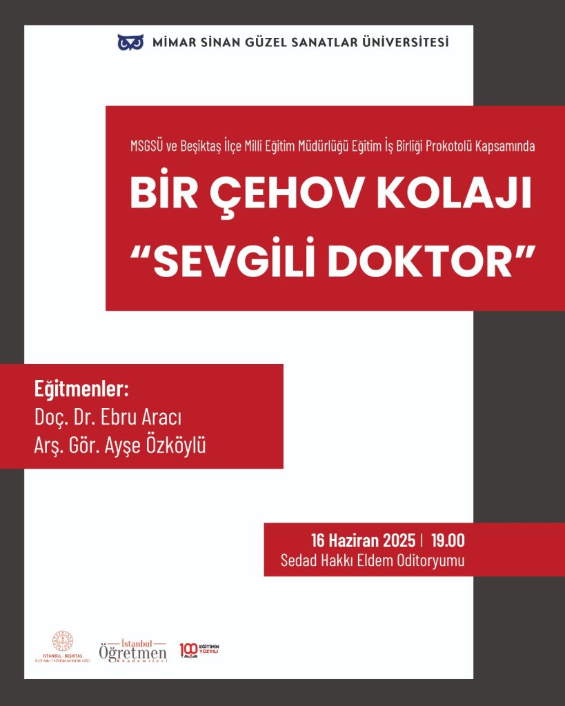 16 Haziran 2025, 19:00Üniversitemiz ve Beşiktaş İlçe Millî Eğitim Müdürlüğü Eğitim İş Birliği Protokolü kapsamında hazırlanan Bir Çehov Kolajı “Sevgili Doktor” başlıklı gösteri, 16 Haziran 2025 tarihinde Sedad Hakkı Eldem Oditoryumu’nda yapılacaktır.
