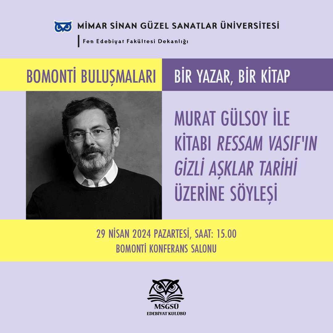 29 Nisan 2024, 15:00Fen Edebiyat Fakültesi Dekanlığı ile MSGSÜ Edebiyat Kulübü’nün Bomonti Buluşmaları kapsamında düzenlediği “Murat Gülsoy ile Ressam Vasıf’ın Gizli Aşklar Tarihi Üzerine Söyleşi” başlıklı etkinlik 29 Nisan 2024 tarihinde Bomonti Konferans Salonu’nda yapılacaktır.