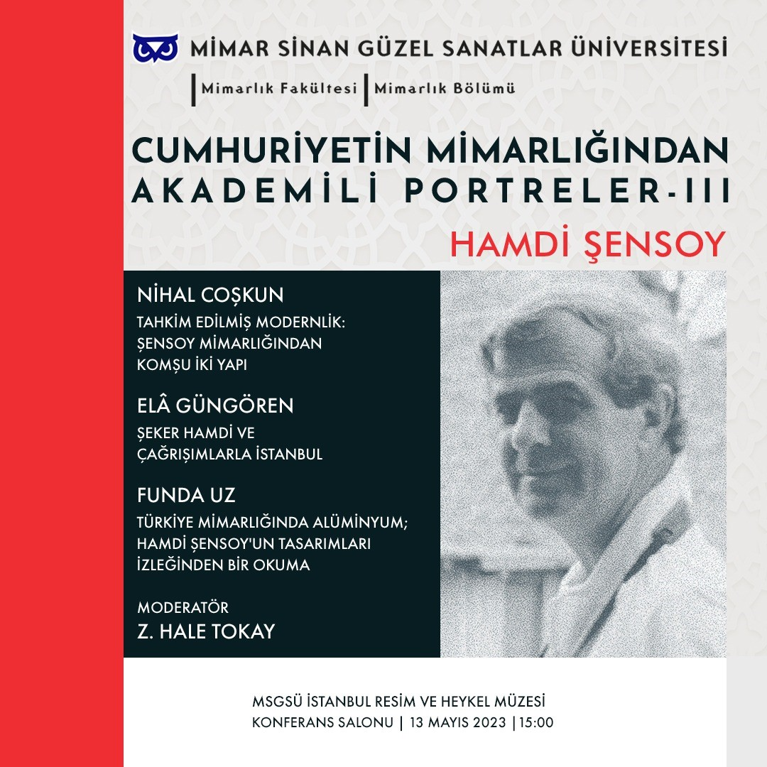 13 Mayıs 2023, 15:00Mimarlık Bölümü tarafından düzenlenen “Cumhuriyetin Mimarlığından Akademili Portreler – III, Hamdi Şensoy” başlıklı toplantı 13 Mayıs 2023 tarihinde İstanbul Resim ve Heykel Müzesi’nde yapılacaktır.