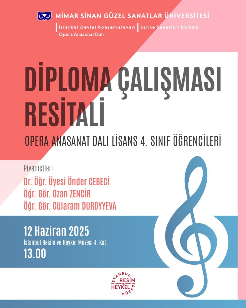Opera Anasanat Dalı Lisans 4. Sınıf Öğrencileri Diploma Çalışması Resitali, 12 Haziran 2025 tarihinde İstanbul Resim ve Heykel Müzesi’nde verilecektir.
