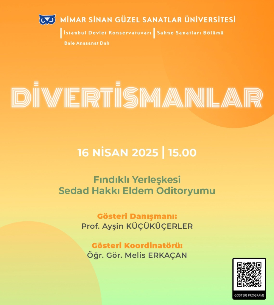 Bale Anasanat Dalı tarafından düzenlenen “Divertismanlar” başlıklı gösteri 16 Nisan 2025 tarihinde Sedad Hakkı Eldem Oditoryumu’nda sahnelenecektir.