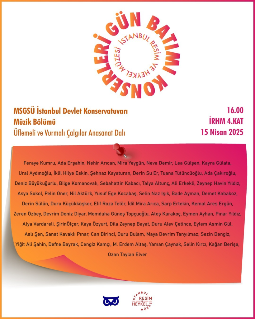 Gün Batımı Konserleri kapsamında Üflemeli ve Vurmalı Çalgılar Anasanat Dalı tarafından hazırlanan program 15 Nisan 2025 tarihinde İstanbul Resim ve Heykel Müzesi 4. Kat’ta yapılacaktır.