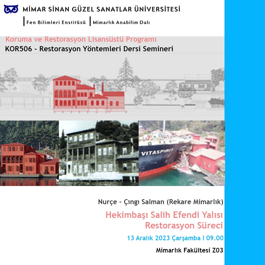 13 Aralık 2023, 09:00Mimarlık Anabilim Dalı tarafından Koruma ve Restorasyon Lisansüstü Programı Seminerleri kapsamında düzenlenen “Hekimbaşı Salih Efendi Yalısı Restorasyon Süreci” başlıklı etkinlik 13 Aralık 2023 tarihinde yapılacaktır.