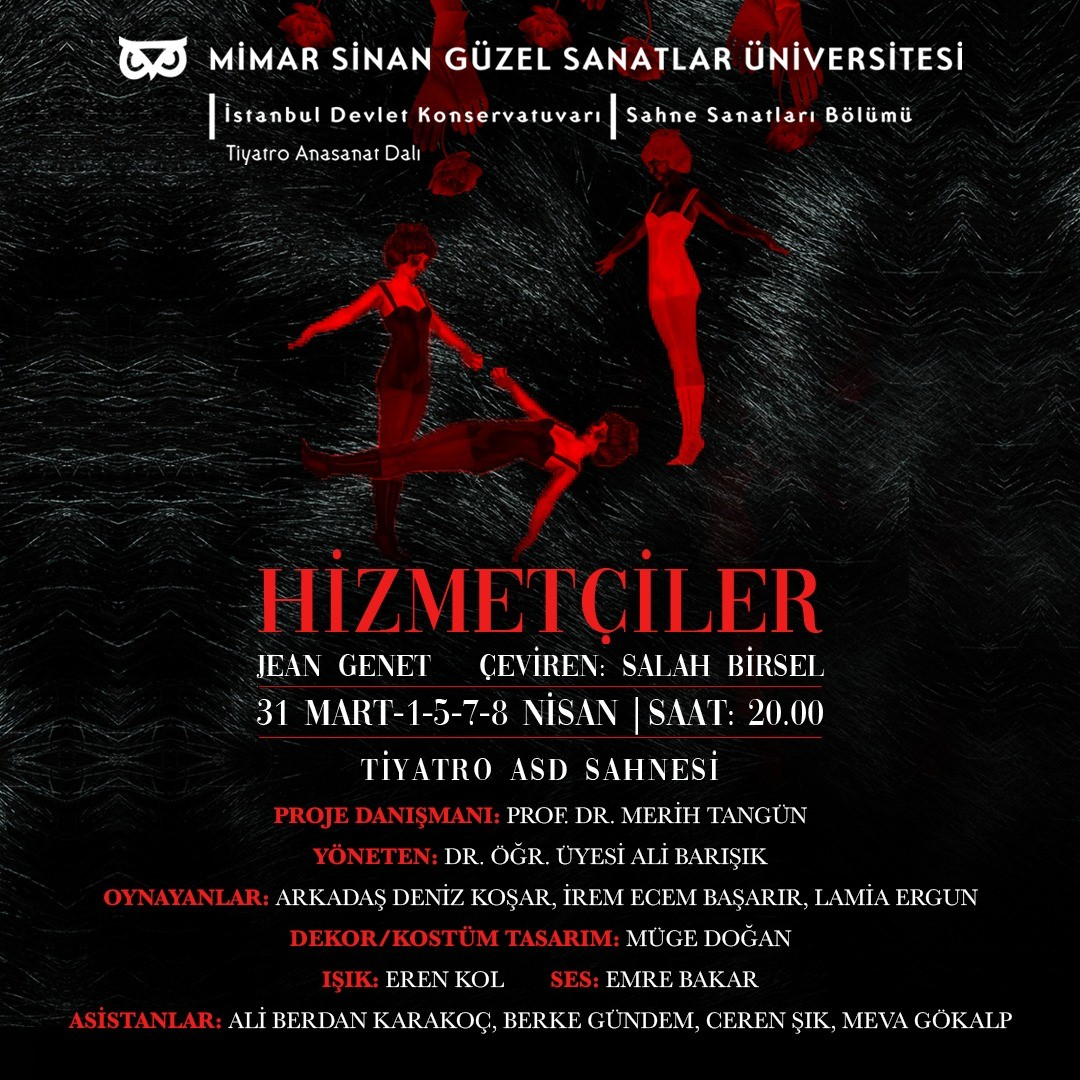 31 Mart 2023, 20:00Tiyatro Anasanat Dalı tarafından düzenlenen “Hizmetçiler” oyunu 31 Mart ve 1, 5, 7, 8 Nisan 2023 tarihlerinde sahnelenecektir.