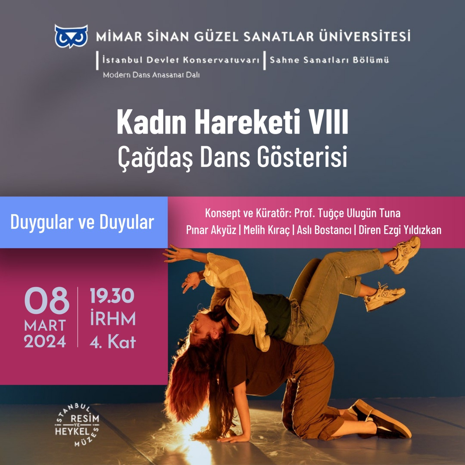 08 Mart 2024, 19:30Modern Dans Anasanat Dalı tarafından 8 Mart Dünya Kadınlar Günü etkinlikleri kapsamında bu yıl sekizincisi düzenlenen “Kadın Hareketi” gösterisi İstanbul Resim ve Heykel Müzesi’nde yapılacaktır.
