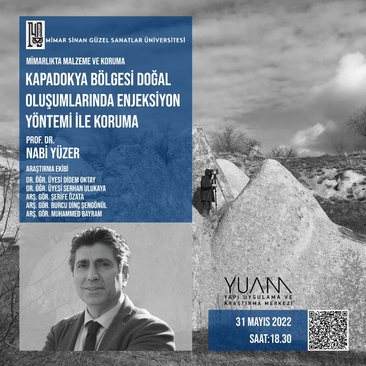 31 Mayıs 2022, 18:30Yapı Uygulama ve Araştırma Merkezi tarafından “Mimarlıkta Malzeme ve Koruma” serisi kapsamında düzenlenen “Kapadokya Bölgesi Doğal Oluşumlarında Enjeksiyon Yöntemi ile Koruma” başlıklı seminere aşağıdaki bağlantıdan katılabilirsiniz.