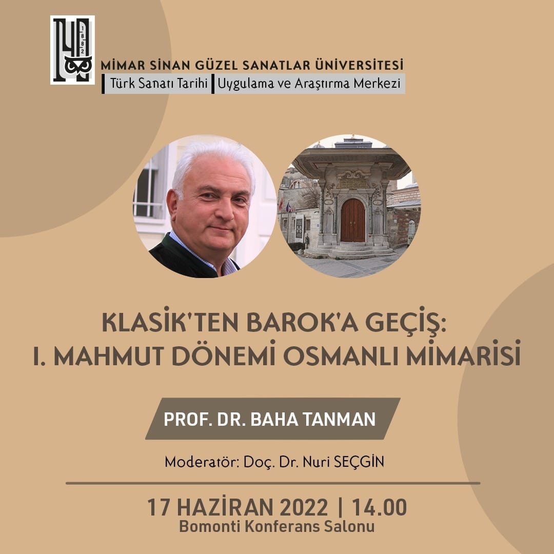 17 Haziran 2022, 14:00Türk Sanatı Tarihi Uygulama ve Araştırma Merkezi’nin düzenlediği konferans serisi kapsamında Prof. Dr. Baha Tanman’ın “Klasik’ten Barok’a Geçiş: I. Mahmut Dönemi Osmanlı Mimarisi” üzerine konuşacağı etkinlik 17 Haziran 2022 saat 14.00’te Bomonti Konferans Salonunda yapılacaktır.