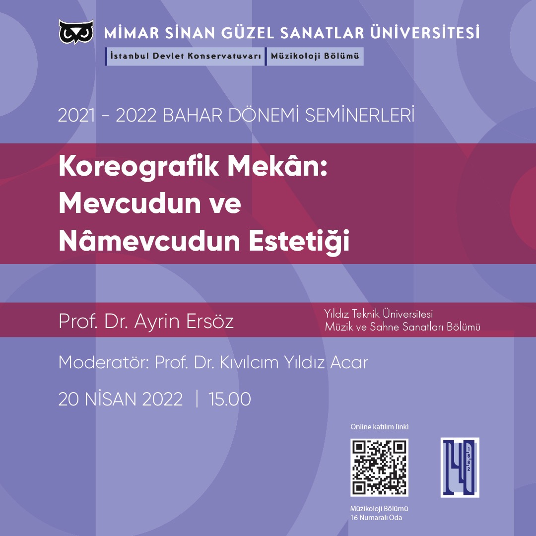 20 Nisan 2022, 15:00Müzikoloji Bölümü tarafından düzenlenen 2021 – 2022 Bahar Dönemi Seminerleri serisinin bu haftaki konuğu “Koreografik Mekân: Mevcudun ve Nâmevcudun Estetiği” başlıklı konuşmasıyla Prof. Dr. Ayrin Ersöz olacaktır.