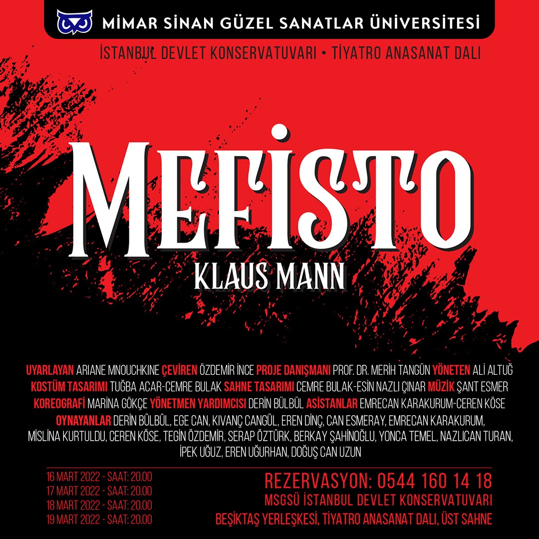 İstanbul Devlet Konservatuvarı Tiyatro Anasanat Dalı tarafından düzenlenen “Mefisto” oyununun bilgilerini aşağıda bulabilirsiniz.