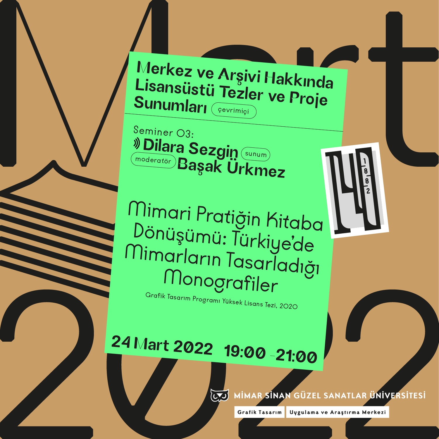 23 Mart 2022Grafik Tasarım Uygulama ve Araştırma Merkezi’nin 140. yıl etkinlikleri kapsamında düzenlediği “Mimari Pratiğin Kitaba Dönüşümü: Türkiye’de Mimarların Tasarladığı Monografiler” başlıklı seminerde Dr. Öğr. Üyesi Başak Ürkmez moderatörlüğünde Dilara Sezgin konuşacaktır.