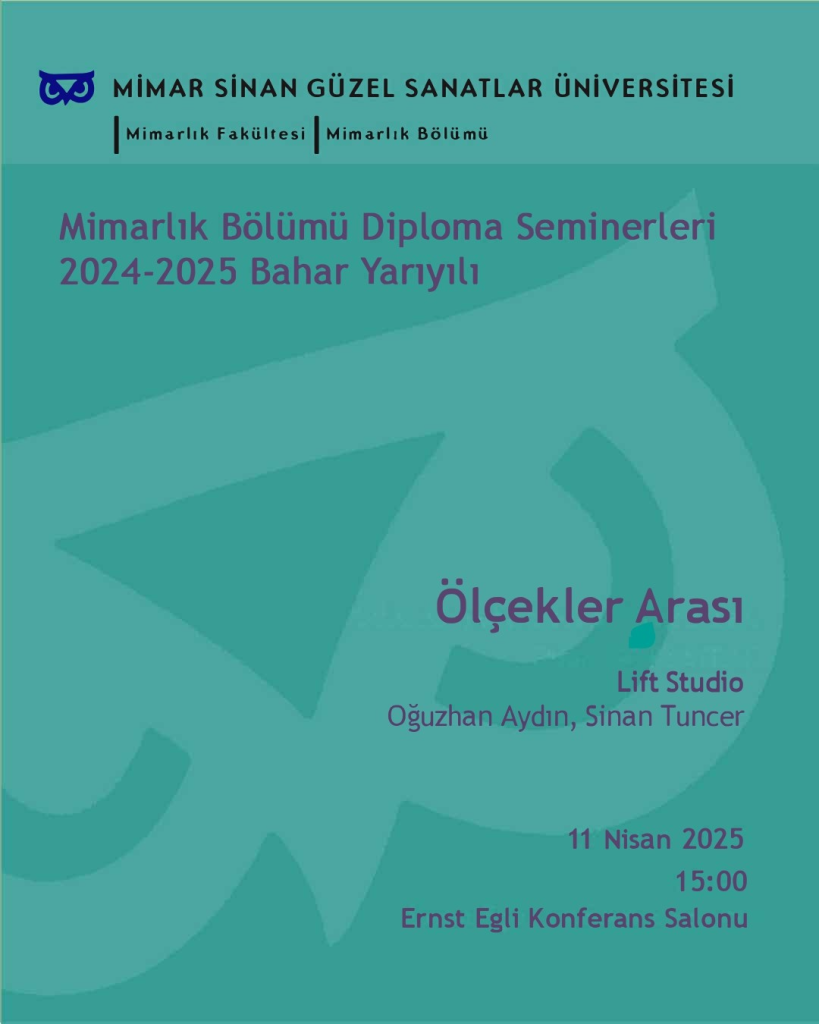 Mimarlık Bölümü tarafından Diploma Seminerleri serisi kapsamında düzenlenen “Ölçekler Arası” başlıklı etkinlik 11 Nisan 2025 tarihinde Ernst Egli Konferans Salonu’nda yapılacaktır.