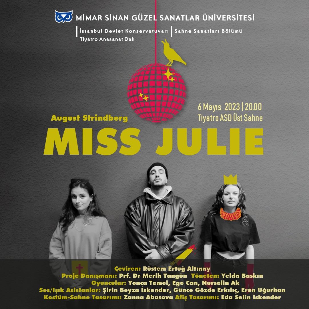 Miss Julie 06 Mayıs 2023, 20:00 Tiyatro Anasanat Dalı tarafından düzenlenen “Miss Julie” oyunu 6 Mayıs 2023 tarihinde sahnelenecektir. Yer: Tiyatro ASD Üst Sahne Saat: 20.00