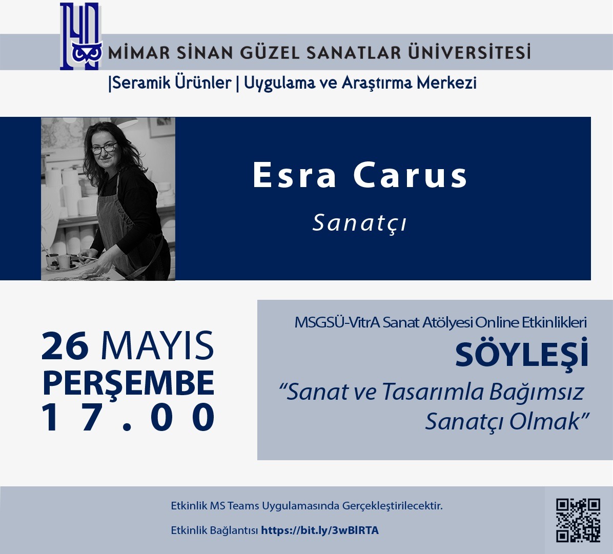 26 Mayıs 2022, 17:00Seramik Ürünler Uygulama ve Araştırma Merkezi tarafından düzenlenen söyleşide Esra Carus “Sanat ve Tasarımla Bağımsız Sanatçı Olmak” üzerine konuşacaktır.