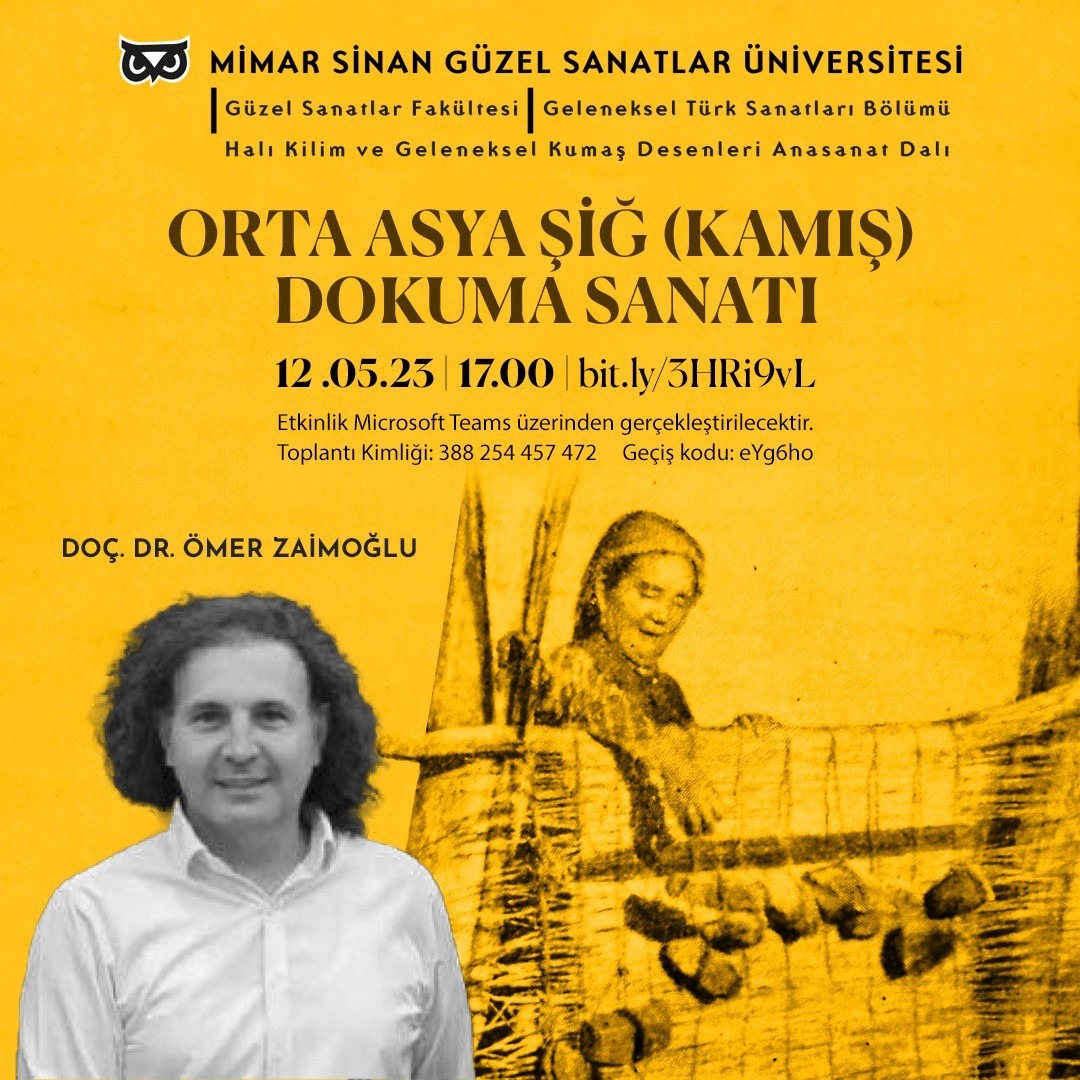 Orta Asya Şiğ (Kamış) Dokuma Sanatı 12 Mayıs 2023, 17:00 Geleneksel Türk Sanatları Bölümü tarafından düzenlenen “Orta Asya Şiğ (Kamış) Dokuma Sanatı” başlıklı söyleşiye aşağıdaki bağlantıdan katılabilirsiniz. Tarih: 12 Mayıs 2023 Bağlantı