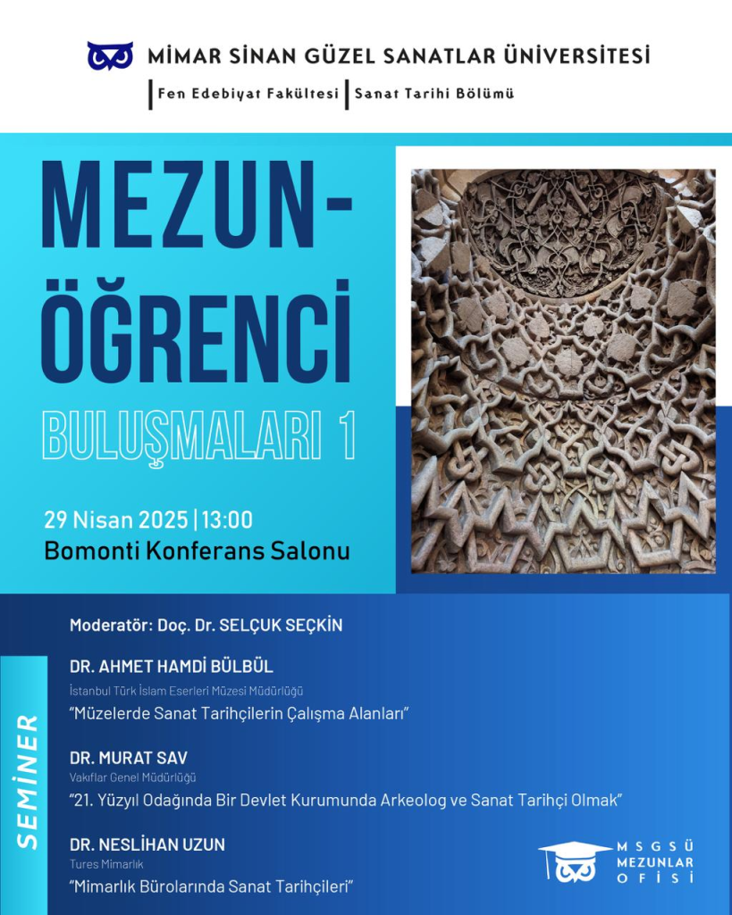 29 Nisan 2025, 13:00Sanat Tarihi Bölümü ve MSGSÜ Mezunlar Ofisi tarafından Mezun – Öğrenci Buluşmaları kapsamında düzenlenen seminer 29 Nisan 2025 tarihinde Bomonti Konferans Salonu’nda verilecektir.