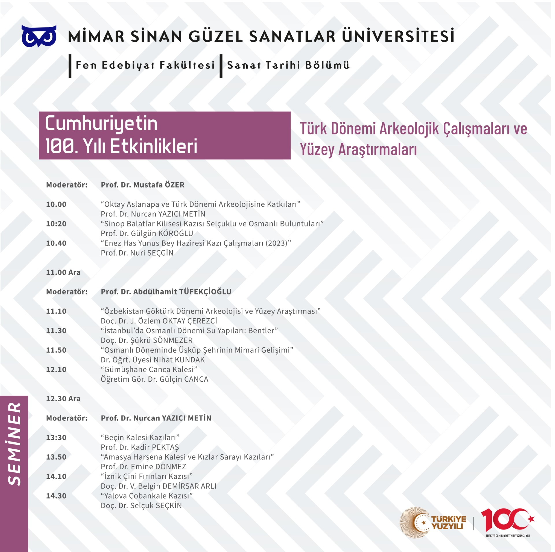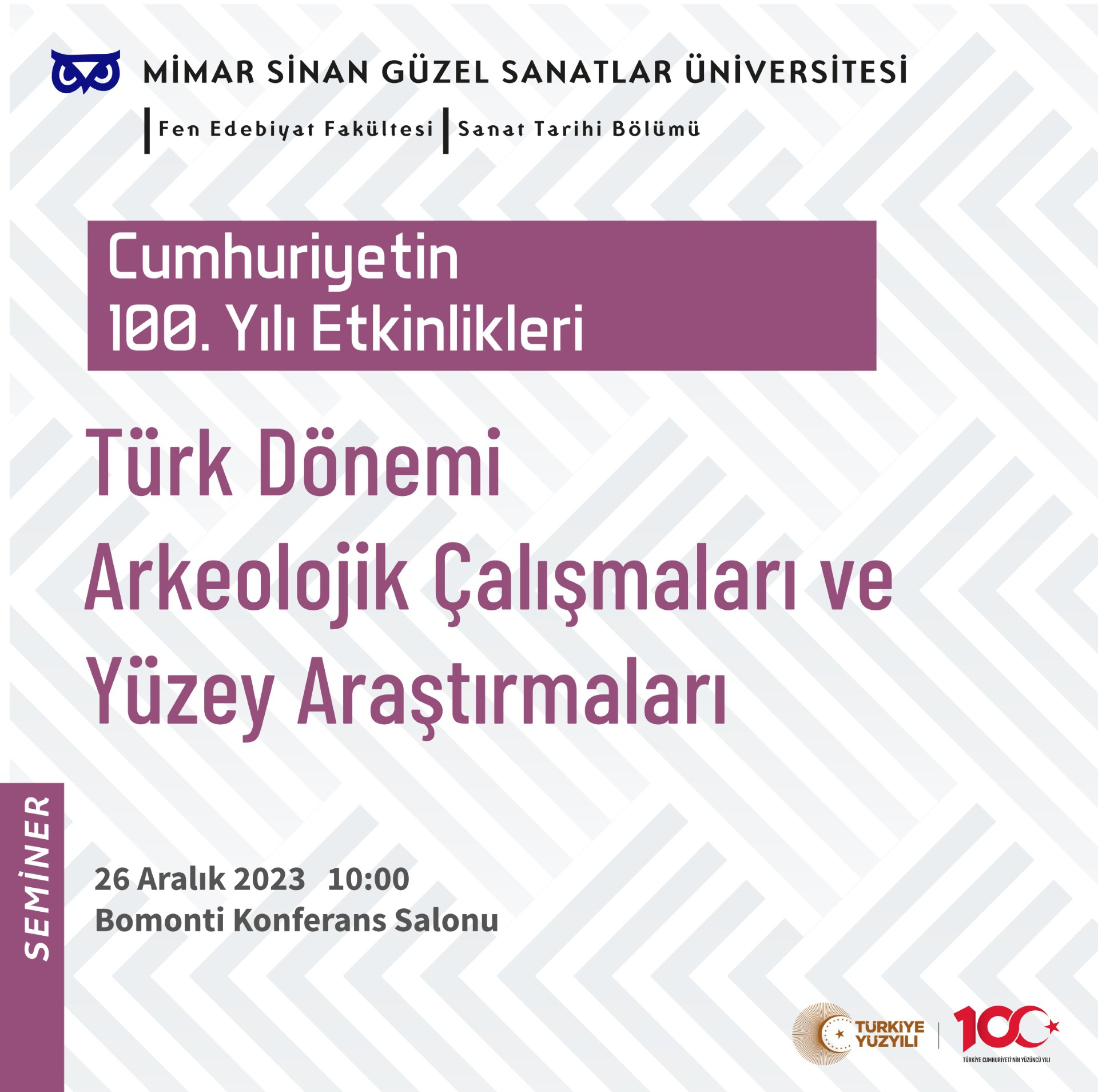 26 Aralık 2023, 10:00Cumhuriyetin 100. Yılı Etkinlikleri kapsamında Sanat Tarihi Bölümü tarafından düzenlenen “Türk Dönemi Arkeolojik Çalışmaları ve Yüzey Araştırmaları” başlıklı seminer, 26 Aralık 2023 tarihinde Bomonti Konferans Salonu’nda verilecektir.