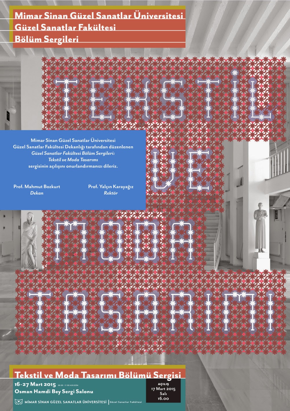 17 Mart 2015Mimar Sinan Güzel Sanatlar Üniversitesi Güzel Sanatlar Fakültesi Dekanlığı tarafından düzenlenen Tekstil ve Moda Tasarımı Bölüm Sergimizi onurlandırmanızı dileriz.