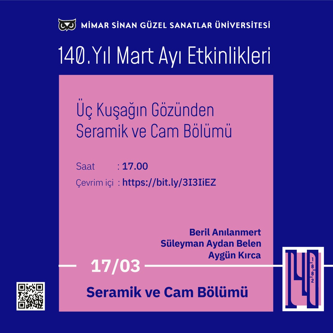 15 Mart 2022140. Yıl Mart Ayı Etkinlikleri kapsamında Seramik ve Cam Bölümü tarafından düzenlenen “Üç Kuşağın Gözünden Seramik ve Cam Bölümü” başlıklı panelde Beril Anılanmert, Süleyman Aydan Belen ve Aygün Kırca konuşacaktır.