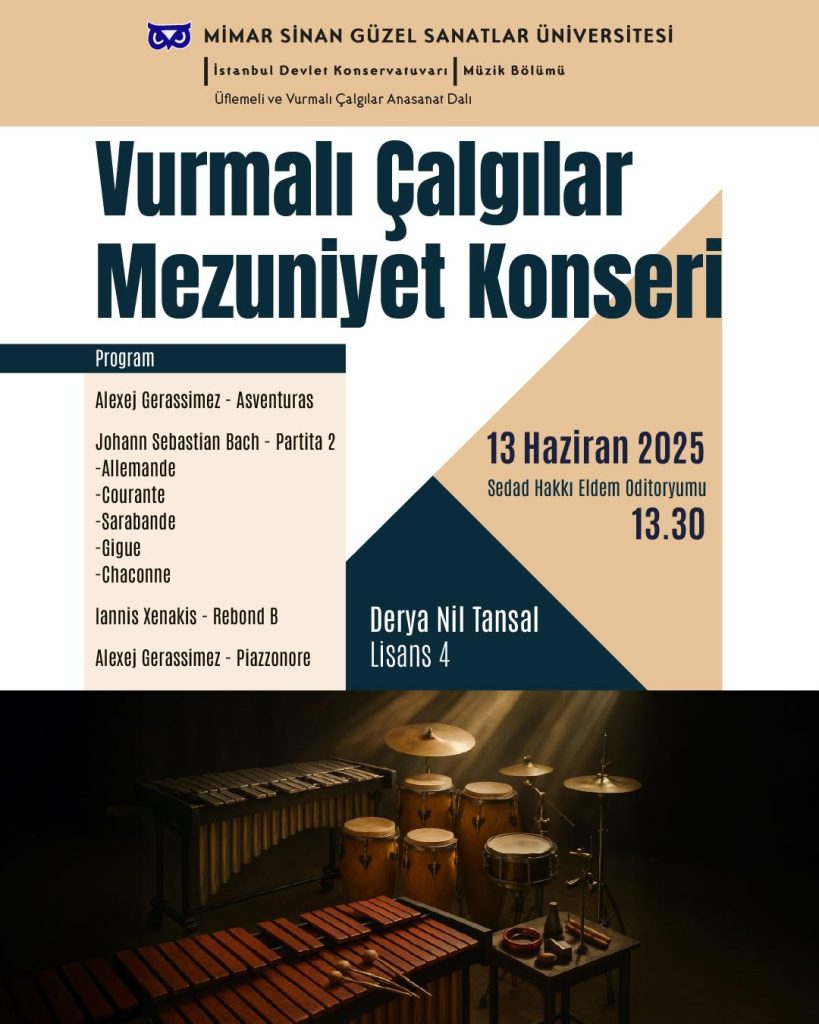 Üflemeli ve Vurmalı Çalgılar Anasanat Dalı tarafından düzenlenen “Vurmalı Çalgılar Mezuniyet Konseri” 13 Haziran 2025 tarihinde Sedad Hakkı Eldem Oditoryumu’nda verilecektir.