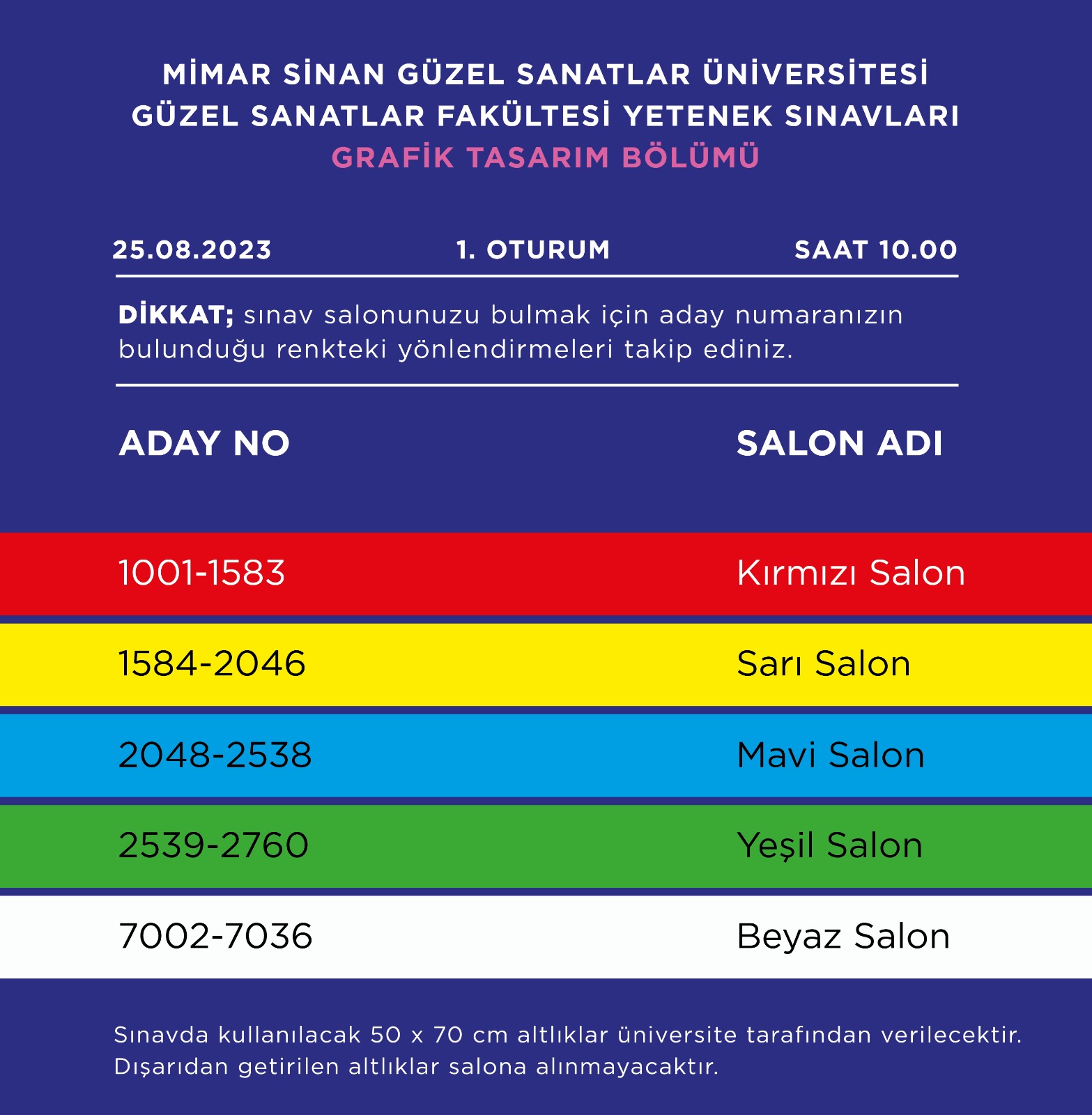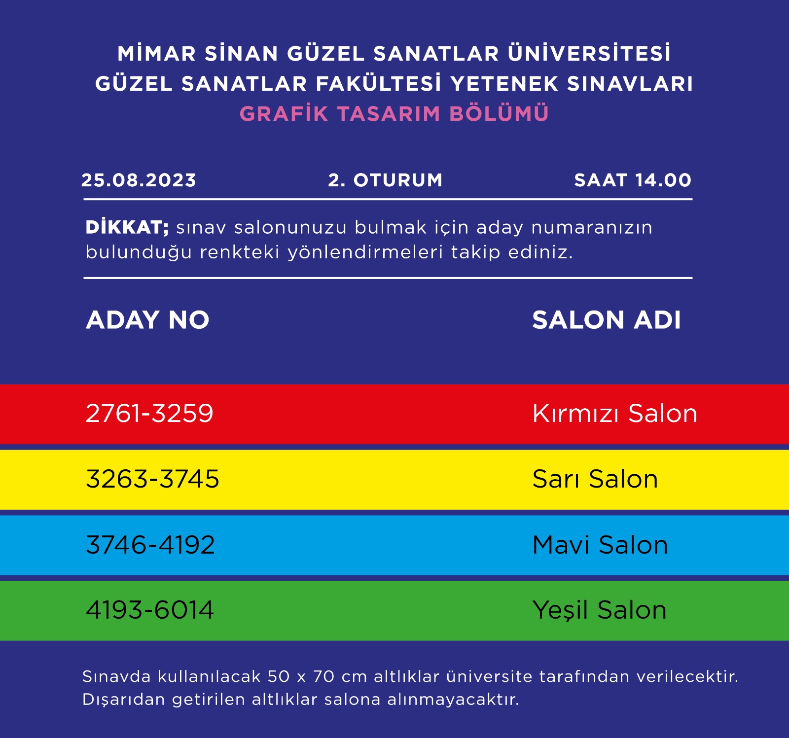 22 Ağustos 20232023-2024 Eğitim-Öğretim Yılı Mimar Sinan Güzel Sanatlar Üniversitesi Güzel Sanatlar Fakültesi Yetenek Sınavları kapsamında Grafik bölümü baraj sınavı 25 Ağustos 2023 tarihinde 2 oturumda gerçekleştirilecektir.