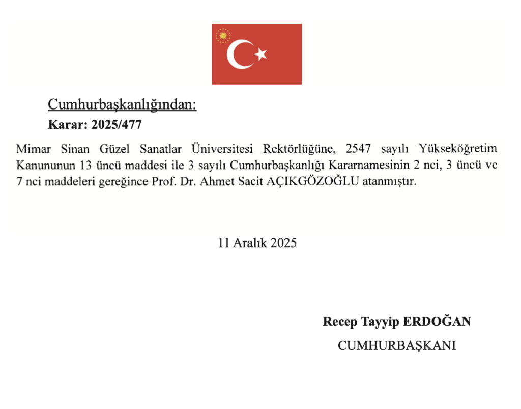 12 Aralık 2025Prof. Dr. Ahmet Sacit Açıkgözoğlu hocamız, 12 Aralık 2025 tarihli Resmi Gazetede ilan edilen, 2025/477 sayılı Cumhurbaşkanlığı kararnamesi ile Mimar Sinan Güzel Sanatlar Üniversitesi Rektörü olarak atanmıştır.